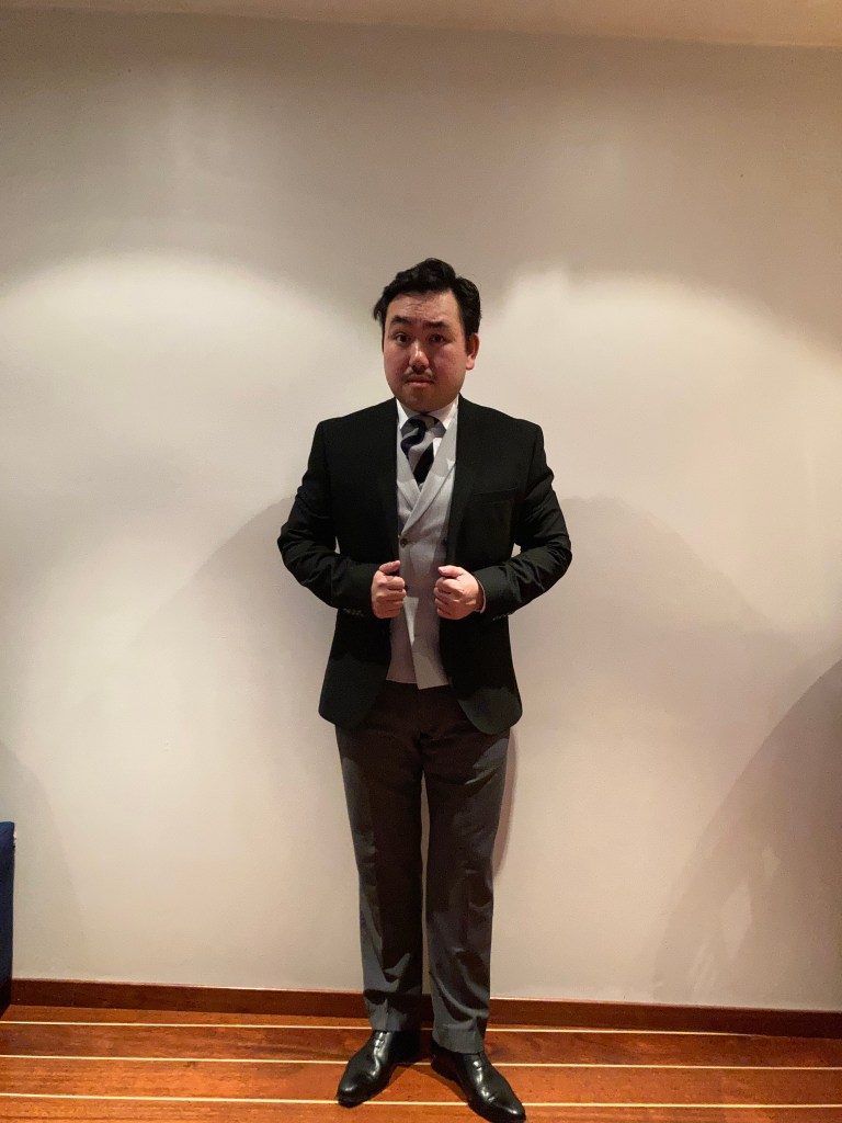 Først må vi bevege oss inn i temaet der svart skal forsøke å komplimentere noe annet. I dette eksemplet har jeg valgt å gå med en typisk «strolling suit», som egentlig er en full dress kledd på dagtid. Da begrunnelsen for at full svart dress var for formell til daglig antrekk, fant de opp bedre løsninger for å gjøre dressen mindre formell. I denne komposisjonen kan vi se hvordan svart fyller ut fargene grå og blå – som resten av antrekket egentlig er bygd opp av.