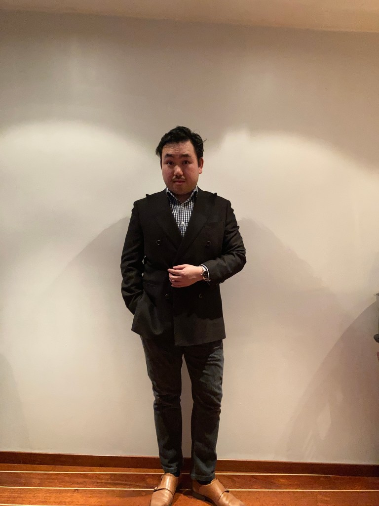 Svart kan også dele inn antrekket ditt i to. Det kan også gi fra seg en komposisjon av synergi. I de to bildene over har jeg forsøkt å illustrere hvordan en monokromatisk antrekk i grå kan fungere godt sammen med svart. Man merker til hvor skillet mellom svart og grått er. I det andre bildet har jeg implementert en mørke brun dressjakke i kombinasjon med bleknet grå bukser, men likevel en hint av svart. I tillegg til dette har svart fargen gitt fra seg i mønsteret av ruter på skjorta. Svart som skygge har dannet grunnlaget for helheten av antrekket.