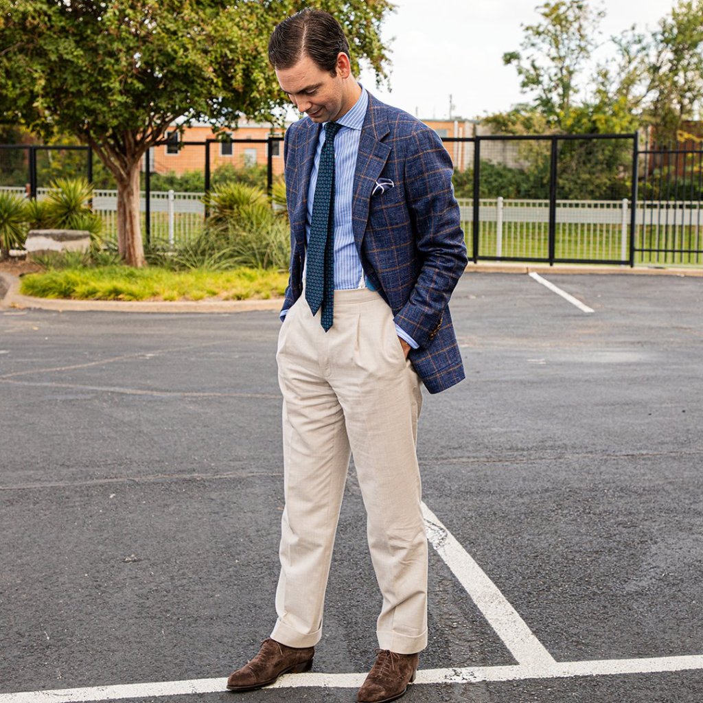 Bukse: Buksa er kjøpt fra Sønnik i Lillemarkens Kristiansand, og merket er fra Jean Paul. Ukjent for merket, men fargen, høyden på buksa og den uformelle stilen gjør at plagget passer bra til selve antrekket. Tro det eller ei, fikk det på salg til 399!